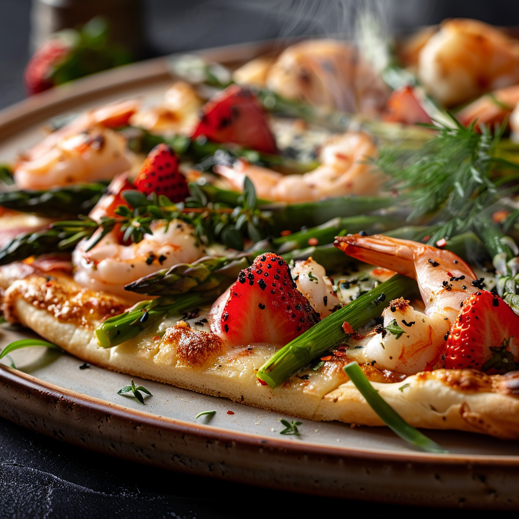 Knuspriger Flammkuchen aus der Heißluftfritteuse mit Spargel, Erdbeeren und Garnelen