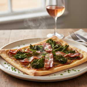 Knuspriger Flammkuchen mit würzigem Grünkohl und Speck