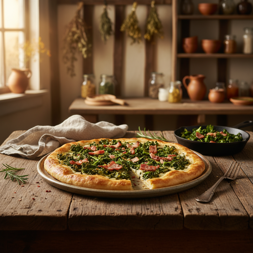 Dieser Flammkuchen mit Grünkohl vereint die klassische Elsässer Art der Zubereitung mit einer saisonalen, winterlichen Komponente. Anstelle des herkömmlichen Belags sorgt hier die Kombination aus **herbem Grünkohl**, salzigem **Speck** und der cremigen **Crème fraîche** für ein ausgewogenes Geschmacksprofil. Der Schlüssel zu einem gelungenen Flammkuchen liegt nicht in komplexen Zutaten, sondern in der korrekten **Teigführung** und der **Backtemperatur**. Dieses Rezept verzichtet bewusst auf Hefe, um einen **hauchdünnen, knusprigen Boden** zu garantieren, der im Ofen Blasen wirft, anstatt wie eine Pizza aufzugehen. In diesem Beitrag erfährst du, wie du den **Öl-Wasser-Teig** optimal verarbeitest und warum der Grünkohl bei diesem Verfahren nicht vorgekocht werden muss.