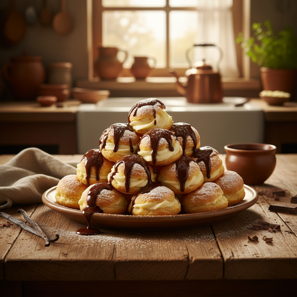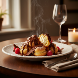 Rezept: Luftige Profiteroles mit cremiger Vanillefüllung und dunkler Schokoladensauce