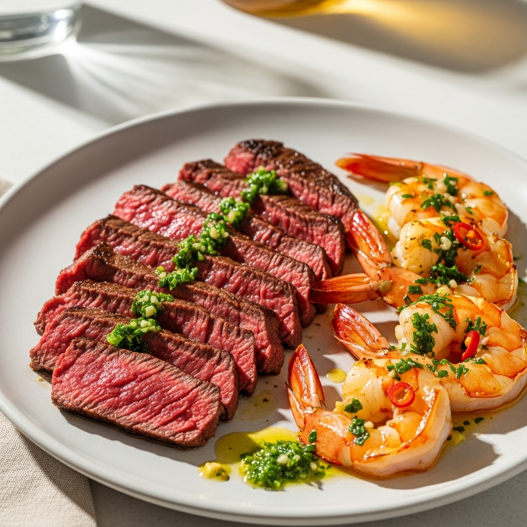 Mediterrane Bavette mit saftigen Gambas in Knoblauch-Weißwein-Sauce