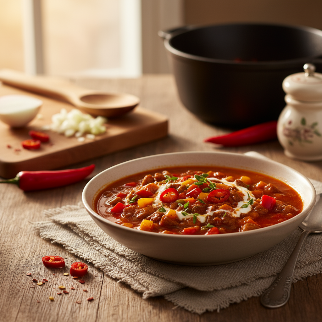 Ein Gulasch ist mehr als nur ein Schmorgericht. Es ist das Resultat einer präzisen Abfolge chemischer und physikalischer Prozesse, die bei korrekter Ausführung zu einem außergewöhnlich aromatischen und zarten Ergebnis führen. Dieses Rezept für ein pikantes Gulasch mit Chili, Paprika und Thymian basiert auf klassischen Kochtechniken, die darauf ausgelegt sind, das Maximum an Geschmack aus jeder einzelnen Zutat zu extrahieren. Du erhältst hier nicht nur eine Schritt-für-Schritt-Anleitung, sondern auch das nötige Hintergrundwissen, um die entscheidenden Prozesse zu verstehen und zu meistern. Wir analysieren die Funktion der Zutaten, die Wichtigkeit der Maillard-Reaktion beim Anbraten und den Prozess, der Bindegewebe in zarte Gelatine verwandelt. Das Ergebnis ist ein Gulasch mit einer tiefroten, sämigen Sauce und Fleisch, das auf der Zunge zerfällt.