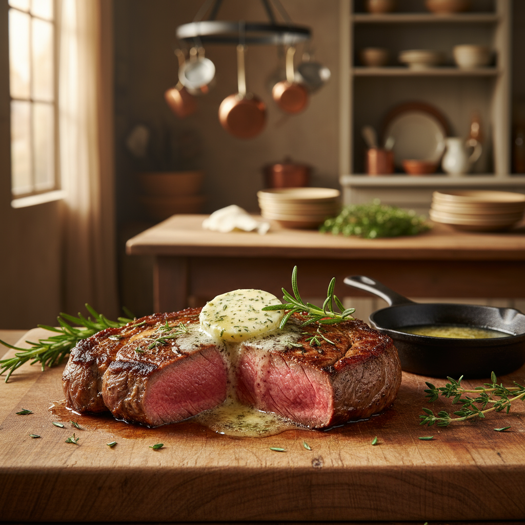Ribeye Steak butterzart gebraten mit Rosmarin Thymian Butter