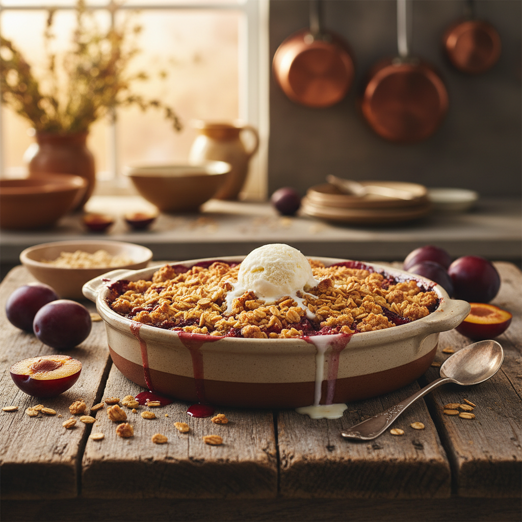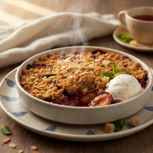 Saftiger Pflaumen-Crumble mit knusprigen Haferflockenstreuseln