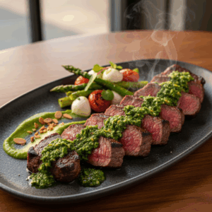 Ein saftiges Flanksteak, auf den Punkt gegrillt und mit einer würzigen Chimichurri Verde serviert, ist ein Gericht von beeindruckender Einfachheit und intensivem Geschmack. Dieses Rezept konzentriert sich auf die wesentlichen Techniken, die ein gutes Steak zu einem herausragenden machen. Du lernst hier nicht nur, wie man ein Flanksteak perfekt zubereitet, sondern auch, wie die frische, säurebetonte Kräutersauce das reiche Fleischaroma optimal ergänzt. Wir behandeln die entscheidenden Schritte – von der Auswahl des richtigen Fleischstücks über die korrekte Grilltechnik bis hin zum unverzichtbaren Ruhen und dem richtigen Aufschneiden. Dieser Beitrag liefert dir das fundierte Wissen, um dieses argentinisch inspirierte Gericht präzise und wiederholbar zu meistern und die physikalischen Prozesse hinter jedem Schritt zu verstehen.