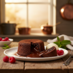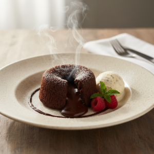 Stürze das Schokoladen-Malheur niemals sofort nach der Entnahme aus dem Ofen. Lasse es zwingend 1 bis 2 Minuten in der Form ruhen. In dieser Zeit festigt sich die empfindliche Kruste durch das Auskühlen minimal, während der Kern heiß bleibt. Stürzt Du zu früh, reißt die Außenwand und der flüssige Kern ergießt sich bereits auf dem Blech.