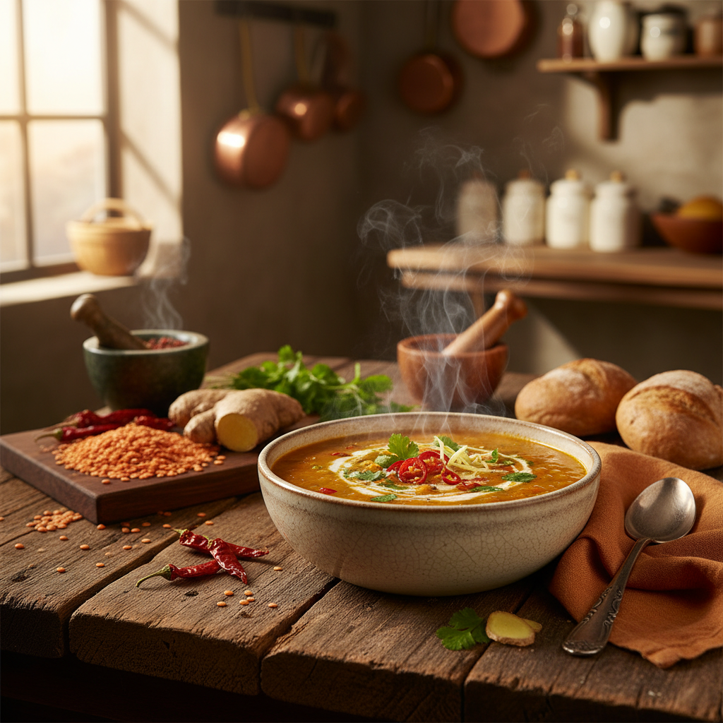 Diese wärmende Linsensuppe mit Ingwer und Chili ist eine nahrhafte und aromatische Mahlzeit, die in weniger als 40 Minuten zubereitet ist. Die Basis aus roten Linsen sorgt für eine natürliche Sämigkeit, während Ingwer, Chili und Kurkuma ein tiefes, komplexes Geschmacksprofil erzeugen. Dieses Rezept ist nicht nur ein einfaches Gericht für kalte Tage, sondern auch ein Musterbeispiel dafür, wie man mit grundlegenden Techniken maximale Aromen aus wenigen Zutaten extrahiert. Du lernst hier, warum das richtige Anrösten der Gewürze entscheidend ist und wie ein einfacher Spritzer Zitrone die gesamte Suppe geschmacklich ausbalanciert. Der Beitrag liefert Dir präzise Anleitungen und das nötige Hintergrundwissen, um dieses Gericht zuverlässig und perfekt zuzubereiten.