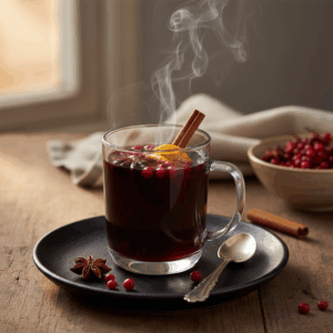 - Servieren: Vor dem Servieren die ganzen Gewürze (Zimtstangen, Nelken, Sternanis, Ingwer) aus dem Saft entfernen. Den heißen Holunderbeersaft in hitzebeständige Gläser oder Tassen füllen und nach Belieben mit einer frischen Orangenscheibe garnieren.