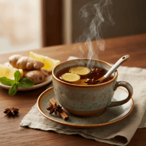 - Frische Kräuter: Ein Zweig frische Minze oder Rosmarin, der in den letzten 2-3 Minuten mitköchelt, verleiht dem Tee eine erfrischende Note.