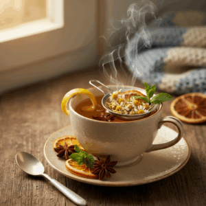 Die Besonderheit dieses Rezepts liegt nicht in einer einzelnen Zutat, sondern in der durchdachten Kombination, die ein synergetisches Geschmacksprofil erzeugt. Während die Kamille eine blumige, leicht süßliche und beruhigende Basis liefert, sorgt der frische Ingwer durch seine Gingerole für eine angenehme, tiefgehende Schärfe und Wärme. Die Bio-Zitrone steuert nicht nur eine frische Säure bei, sondern auch die ätherischen Öle aus ihrer Schale, die das Aroma komplexer machen. Die Gewürze – Zimt, Sternanis und Nelken – ergänzen das Ganze mit einer würzigen, fast weihnachtlichen Tiefe. Das Ergebnis ist ein ausbalanciertes Getränk, bei dem keine Zutat dominiert, sondern jede die anderen unterstützt und hervorhebt.