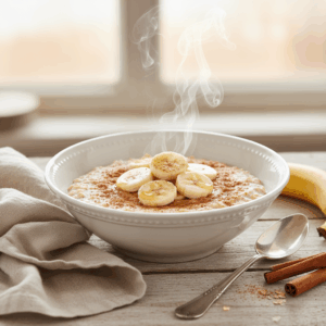 - Servieren: Den fertigen Haferbrei auf zwei Schalen verteilen. Mit frischen Bananenscheiben und gehackten Walnüssen oder Mandeln garnieren und sofort warm genießen.