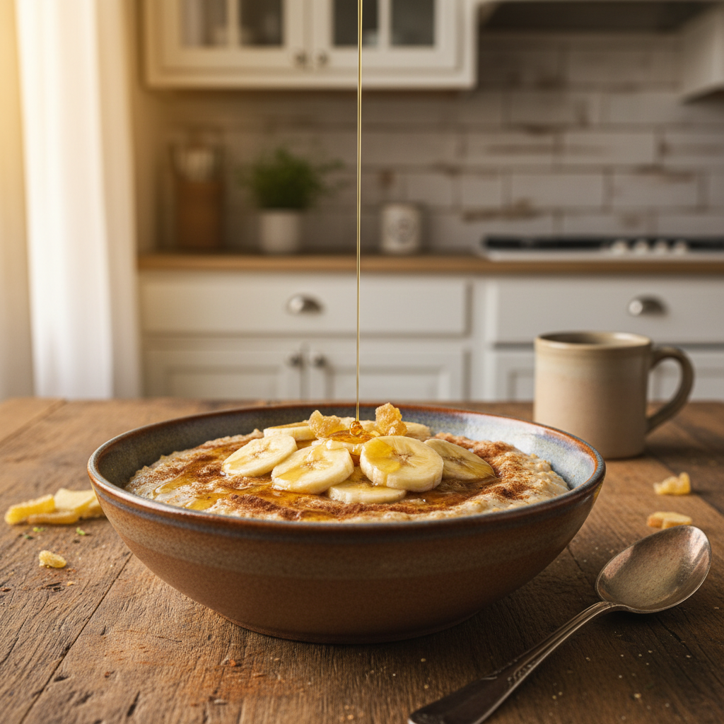 - Servieren: Den fertigen Haferbrei auf zwei Schalen verteilen. Mit frischen Bananenscheiben und gehackten Walnüssen oder Mandeln garnieren und sofort warm genießen.