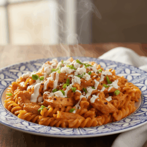 - Servieren: Die Buffalo Chicken Pasta auf Teller verteilen und mit dem restlichen Blauschimmelkäse garnieren. Optional mit frisch geschnittenen Frühlingszwiebeln servieren.