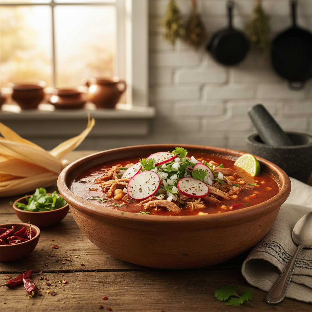 Pozole Rojo ist ein Grundpfeiler der mexikanischen Küche – ein robuster, sättigender Eintopf, der durch seine tiefrote Farbe und komplexe Aromatik besticht. Dieses Rezept konzentriert sich auf die traditionelle Zubereitung mit zarter Schweineschulter, nixtamalisiertem Mais (Hominy) und einer selbst hergestellten Sauce aus getrockneten Guajillo- und Ancho-Chilis. Wir verzichten auf Abkürzungen wie Chilipulver, um ein authentisches Geschmackserlebnis zu gewährleisten. In diesem Beitrag erhältst Du nicht nur eine präzise Anleitung, sondern auch das technische Wissen, um die entscheidenden Schritte zu meistern. Du lernst, wie Du die Chilis korrekt verarbeitest, um ihr volles Aroma ohne Bitterkeit zu extrahieren, und warum die Wahl des Fleisches für die Textur der Brühe entscheidend ist. Das Ergebnis ist eine Pozole, die durch Tiefe, Aroma und eine perfekte Konsistenz überzeugt.
