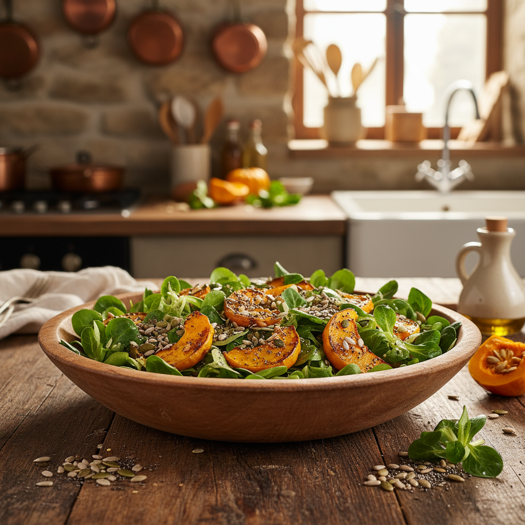 Würziger Feldsalat mit geröstetem Kürbis und Kern-Mix