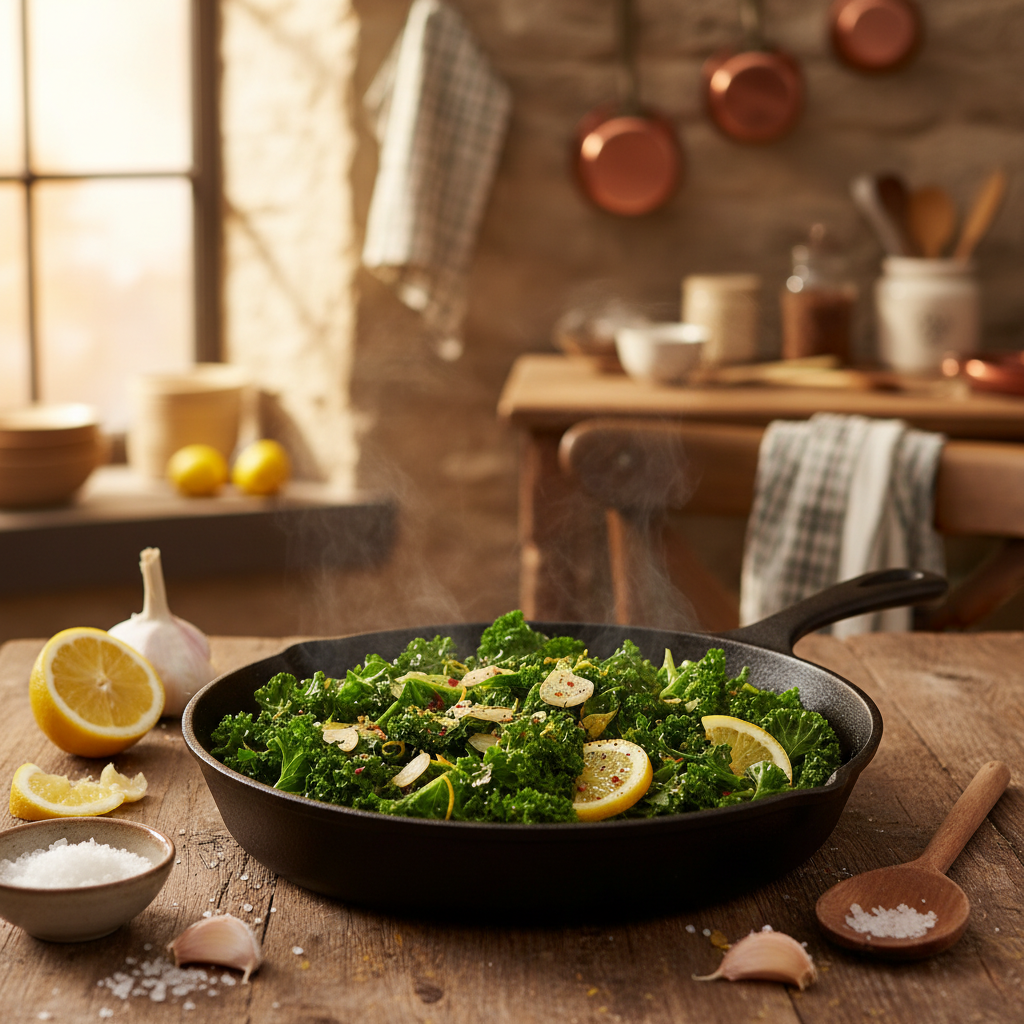Würziger Grünkohl aus der Pfanne mit Knoblauch und Zitrone