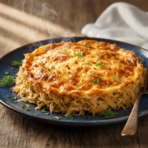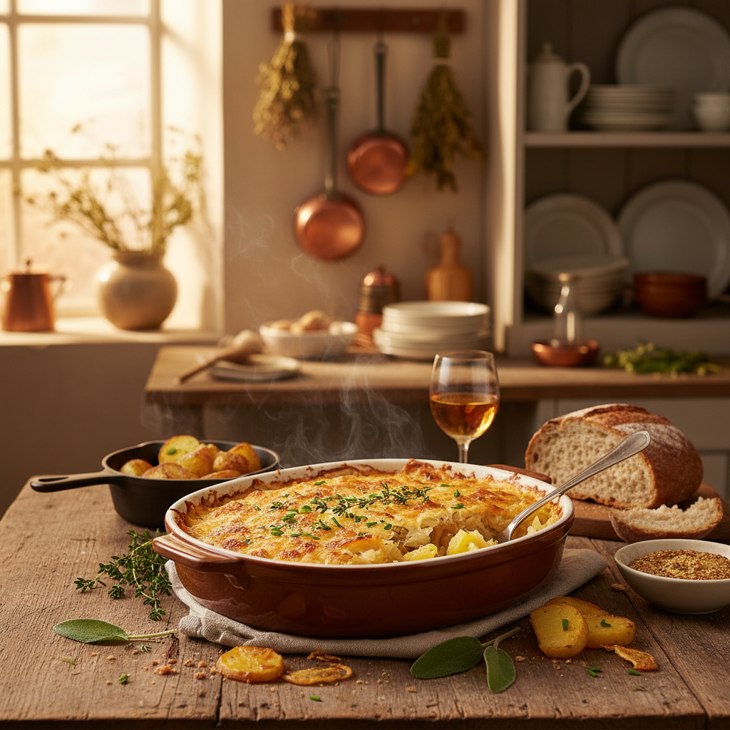 Ein wärmender und sättigender Auflauf, der die würzige Säure von Sauerkraut mit cremigen Kartoffeln und einer goldbraun überbackenen Käsekruste kombiniert. Ein unkompliziertes Gericht, ideal für kalte Tage.