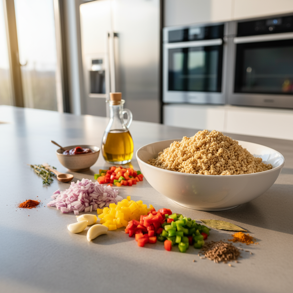 - ✅ Flüssigkeit zum Einweichen: Niemals nur Wasser verwenden. Eine kräftige, heiße Gemüsebrühe mit Sojasauce oder Gewürzen ist entscheidend, da das trockene Granulat diese ersten Aromen tief in sich aufsaugt.