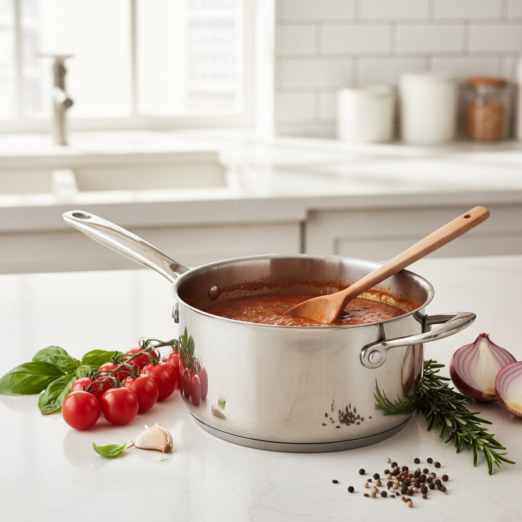 Das Material des Topfes spielt ebenfalls eine Rolle, wenn auch eine untergeordnete im Vergleich zur Form. Materialien mit guter Wärmeleitung wie Kupfer oder Mehrschichtmaterial (Edelstahl mit Aluminiumkern) sorgen dafür, dass die Hitze gleichmäßig verteilt wird. Dies verhindert, dass sich an den Rändern, wo die Flüssigkeit oft niedriger steht und schneller verdunstet, Anbrennungen bilden. Besonders bei stark reduzierten Soßen, die durch den hohen Gehalt an Proteinen und Zucker zähflüssig werden, ist die Gefahr des Anbrennens in Töpfen mit schlechter Wärmeverteilung (Hotspots) groß.