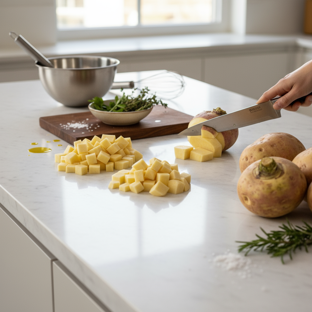 - Vorbereitung (15 Min.): Steckrübe gründlich waschen, beide Enden abschneiden. Mit einem stabilen Messer oder Sparschäler großzügig schälen, sodass die gelbliche Schicht darunter sichtbar wird. Die geschälte Rübe in mundgerechte Würfel (ca. 2-3 cm) oder Spalten schneiden.