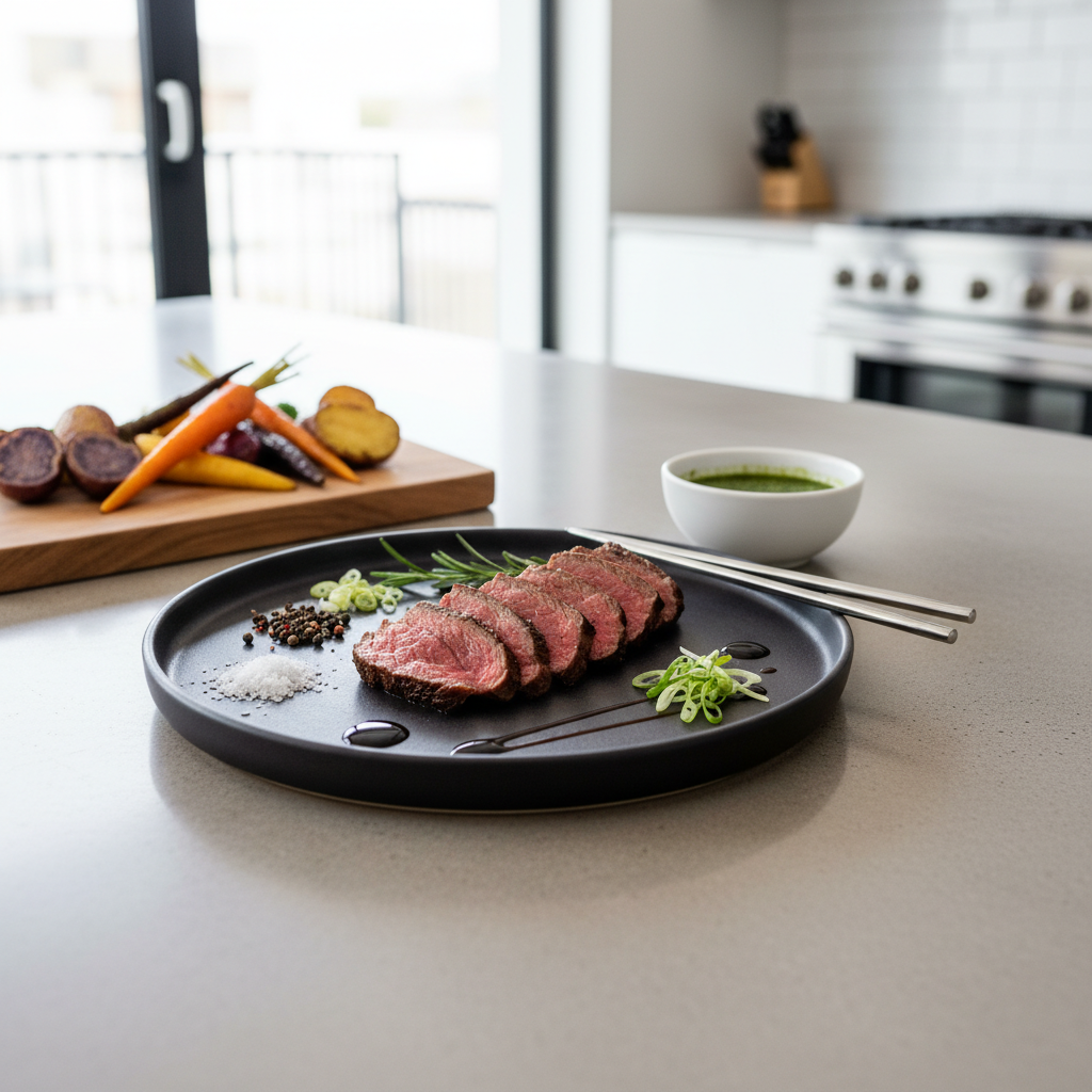 Nach dem Braten folgt ein letzter, unverzichtbarer Schritt: die Ruhephase. Das Steak muss für etwa 5 bis 10 Minuten ruhen, bevor es angeschnitten wird. Während des Bratens ziehen sich die Muskelfasern zusammen und treiben die Säfte zur Mitte des Steaks. In der Ruhephase entspannen sich die Fasern wieder und die Säfte können sich gleichmäßig im gesamten Fleisch verteilen. Schneidet man es zu früh an, läuft der wertvolle Saft einfach aus. Zum Servieren wird Wagyu traditionell in dünne Scheiben (ca. 1 cm dick) quer zur Faser geschnitten. Dies maximiert die Zartheit. Aufgrund seiner Reichhaltigkeit sind die Portionsgrößen kleiner als bei herkömmlichem Steak; oft reichen 100-150 Gramm pro Person völlig aus.