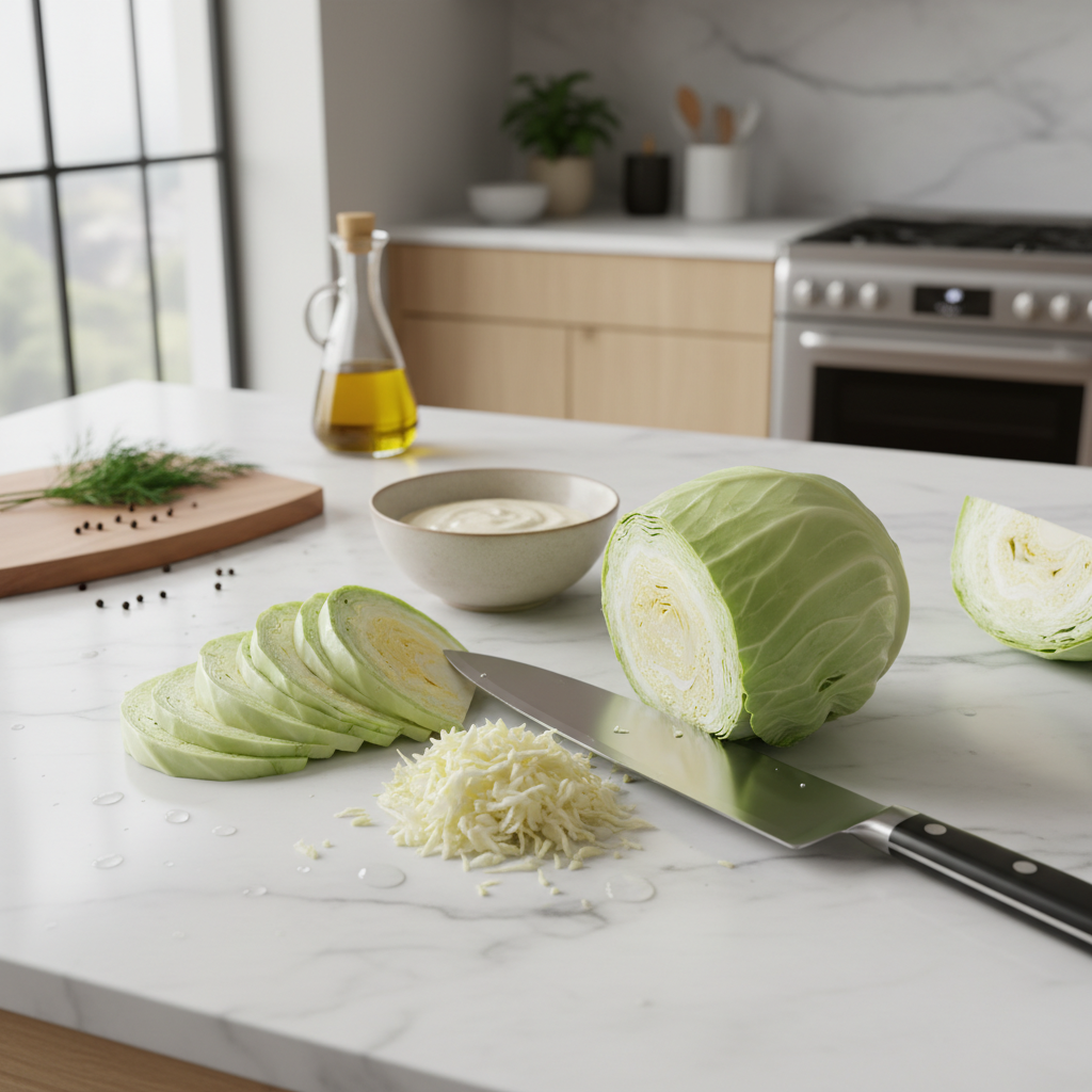 Weißkohl ist roh hervorragend essbar und sehr gesund. In feine Streifen geschnitten oder gehobelt ist er die Basis für klassische Krautsalate wie Coleslaw. Um die feste Zellstruktur aufzubrechen und ihn zarter und bekömmlicher zu machen, wird empfohlen, den geschnittenen Kohl mit Salz zu bestreuen und für einige Minuten kräftig mit den Händen zu kneten. Dadurch tritt Wasser aus, und der Kohl wird weicher und nimmt das Dressing besser auf. So vorbereitet ist roher Weißkohl knackig, frisch und eine ausgezeichnete Zutat für Salate und Rohkostplatten.