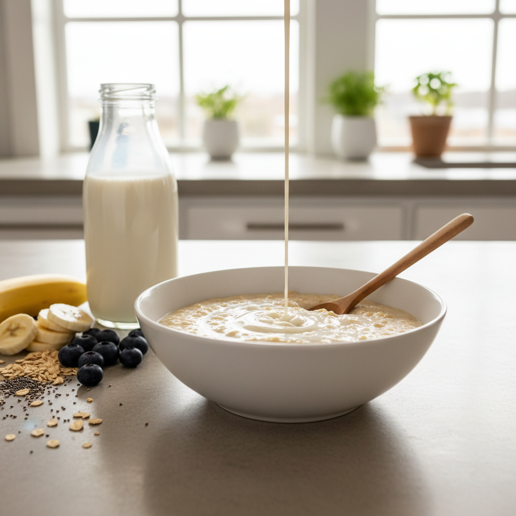 Auch am Frühstückstisch spielt Hafermilch eine zentrale Rolle. Für eine normale Portion Cornflakes, Granola oder Porridge werden in der Regel 150 bis 200 Milliliter Milch benötigt. Ein klassischer Haferdrink steuert somit etwa 70 bis 90 Kilokalorien zum Frühstück bei. Dies entspricht ziemlich genau dem Wert fettarmer Kuhmilch und stellt im Rahmen einer ausgewogenen Mahlzeit eine moderate Energiequelle dar. Besonders bei der Zubereitung von Porridge (Haferbrei), bei dem Haferflocken in Hafermilch gekocht werden, entsteht ein extrem kohlenhydratreiches Frühstück, das zwar sehr lange sättigt, aber aufgrund der „Hafer-in-Hafer“-Kombination in puncto Kalorien- und Kohlenhydratdichte relativ hoch ausfällt.