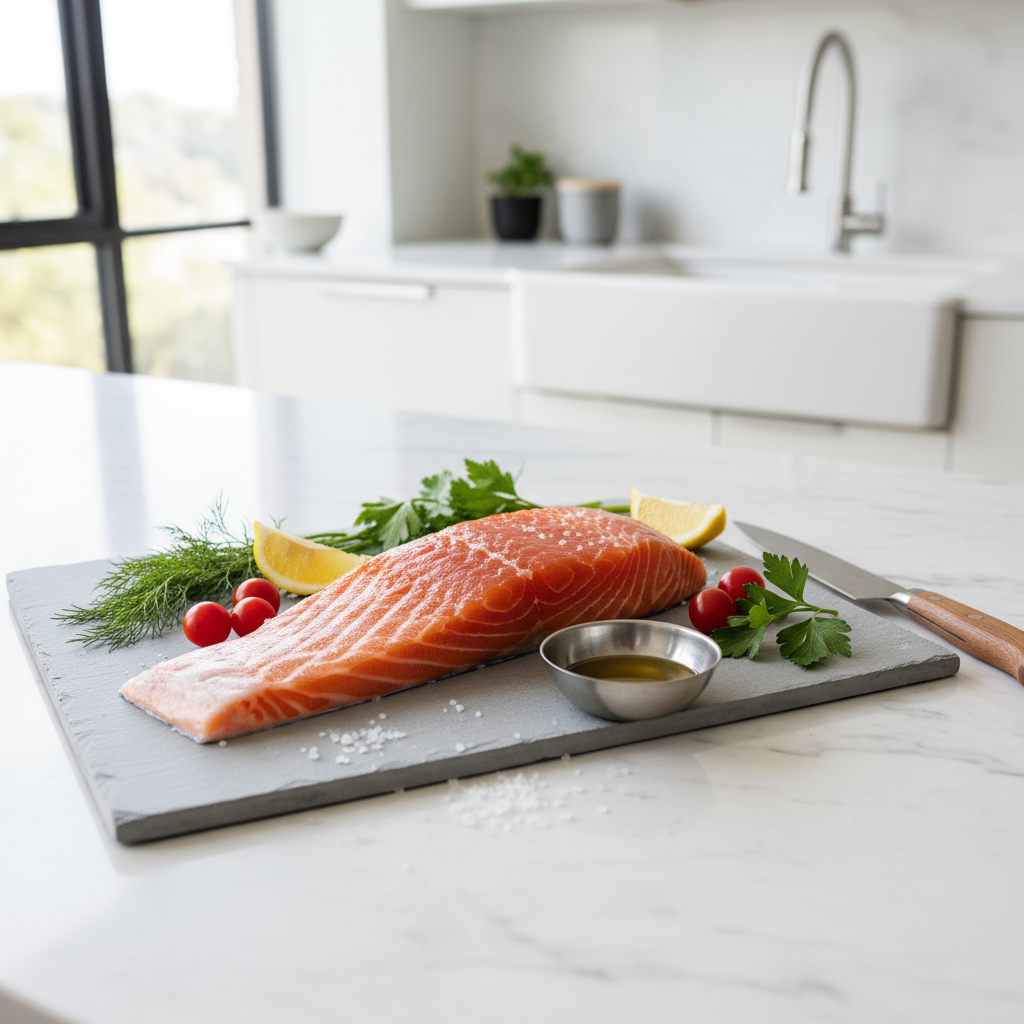 Eine sorgfältige Vorbereitung ist die halbe Miete für ein perfektes Ergebnis bei Wildlachs. Da es sich um ein so empfindliches Produkt handelt, können bereits kleine Fehler in den ersten Schritten die Textur und den Geschmack negativ beeinflussen. Der Prozess beginnt lange vor dem Erhitzen der Pfanne, nämlich beim Auftauen. Die mit Abstand beste Methode, um gefrorenen Wildlachs aufzutauen, ist die langsame Methode im Kühlschrank. Dazu wird der Fisch aus der Vakuumverpackung genommen, auf einen Teller gelegt, mit Frischhaltefolie abgedeckt und für 12 bis 24 Stunden in den Kühlschrank gestellt. Dieser langsame Prozess stellt sicher, dass die Zellstruktur des Fischfleisches intakt bleibt. Schnelles Auftauen unter heißem Wasser oder in der Mikrowelle ist unbedingt zu vermeiden. Die abrupte Temperaturänderung lässt die Eiskristalle im Fischfleisch die Zellwände sprengen, was zu einem wässrigen, matschigen Ergebnis führt und den Fisch bereits teilweise vorgart.
