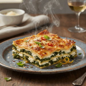 Die Lasagne im vorgeheizten Ofen für 35-40 Minuten backen, bis die Oberfläche goldbraun und die Soße an den Rändern leicht blubbert. Vor dem Anschneiden die Lasagne etwa 10 Minuten ruhen lassen, damit sie sich setzen kann.