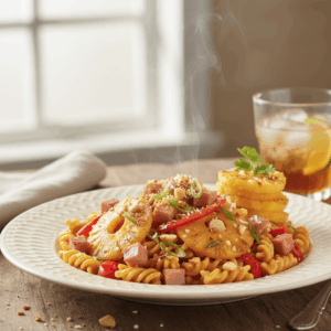 Zutaten vorbereiten: Während die Pasta kocht, Zwiebel und Knoblauch fein würfeln. Den Kochschinken ebenfalls in mundgerechte Würfel schneiden. Falls frische Ananas verwendet wird, diese schälen, den Strunk entfernen und das Fruchtfleisch würfeln.