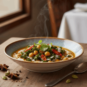 Ein wärmendes und nahrhaftes veganes Curry, das die erdigen Noten von Grünkohl mit der cremigen Süße von Kokosmilch und dem nussigen Geschmack von Kichererbsen verbindet. Aromatische Gewürze runden dieses einfache Gericht ab, ideal für ein schnelles Abendessen.