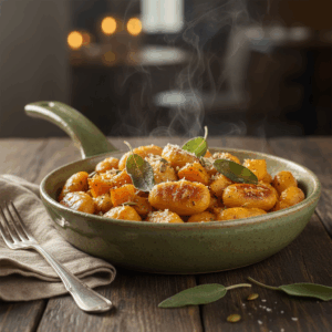 Eine wärmende und aromatische Pfanne, die goldbraun gebratene Gnocchi mit würzigen Kürbiswürfeln, knusprigem Salbei und einer nussigen Butter kombiniert. Ein ideales Gericht für gemütliche Herbstabende, das schnell und einfach zubereitet ist.