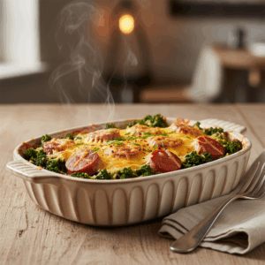 Den Auflauf aus dem Ofen nehmen und vor dem Servieren 5 Minuten ruhen lassen. Heiß mit Salzkartoffeln oder frischem Brot servieren.