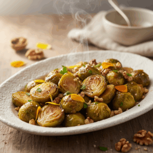 Im vorgeheizten Ofen für ca. 15 Minuten backen. Danach das Blech kurz aus dem Ofen nehmen, die grob gehackten Walnüsse über dem Rosenkohl verteilen und alles für weitere 8-10 Minuten backen, bis der Rosenkohl zart ist und die Ränder eine goldbraune, knusprige Färbung haben.