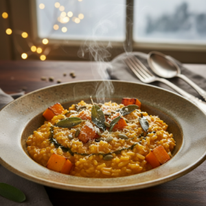 Cremiges Kürbisrisotto mit Weißwein und gebratenem Salbei